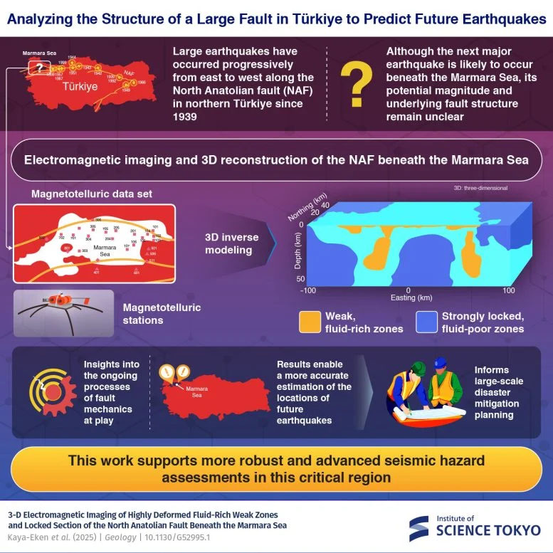 Yeni bir 3B yeraltı modeli, Marmara Denizi altındaki kaya dayanımındaki değişikliklerin Kuzey Anadolu Fayı boyunca gelecekteki büyük depremleri nasıl tetikleyebileceğini gösteriyor. Bulgular, fay mekaniğinin anlaşılmasını geliştiriyor ve İstanbul bölgesi için daha iyi deprem tahmini yapılmasını destekliyor.