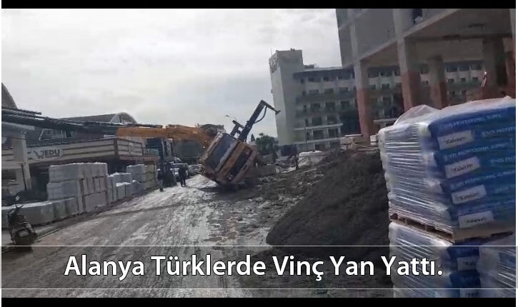 Alanya inşaatı devam eden bir inşaat alanında yanlış konumlandırma ve yükleme yüzünden vinç yan yattı. Neyse ki kimse yaralanmadı ve vinç devrilmedi.