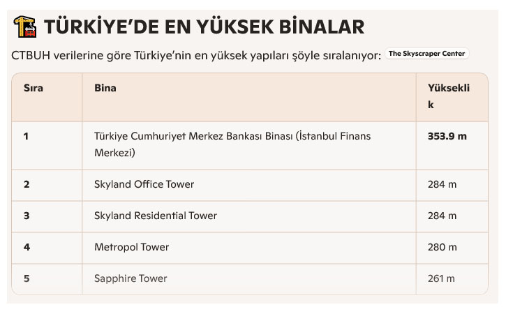 CTBUH verilerine göre Türkiye’nin en yüksek yapıları şöyle sıralanıyor: